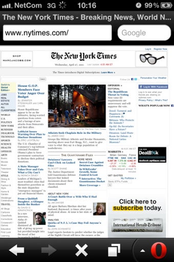 Clairement, cet Opera Mini pour iPhone est un plaisir à utiliser. La fonction de SSR (Small Screen Rendering) y est sûrement pour quelque chose. Elle permet de formater les pages pour les adapter à la taille de votre écran. Les images, les pages, les sites ont alors un tête bien plus "normale", proche de l'expérience d'un navigateur classique. Vous voulez zoomer? Un tap long sur la zone à agrandir suffit. Génial.