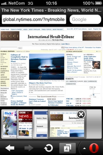 En plus du Speed Dial qui affiche les vignettes de vos sites préférés comme dans la version desktop, Opera mini pour iPhone inclut la navigation par onglets, très réussie. On passe d'un onglet à l'autre avec une grande facilité, même quand plusieurs pages sont ouvertes. Beaucoup plus ergonomique que dans Safari.